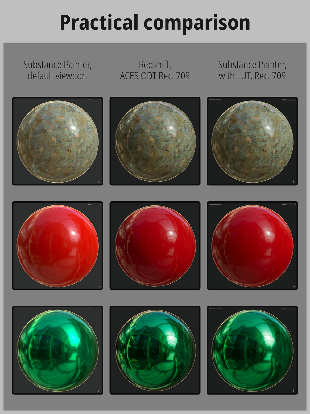 These LUTs rely on the Reinhard tonemapping used in Painter. They give good color accuracy, and good handling of highlights, when compared against pre-rendered images. You can find such a comparison on this page's header.